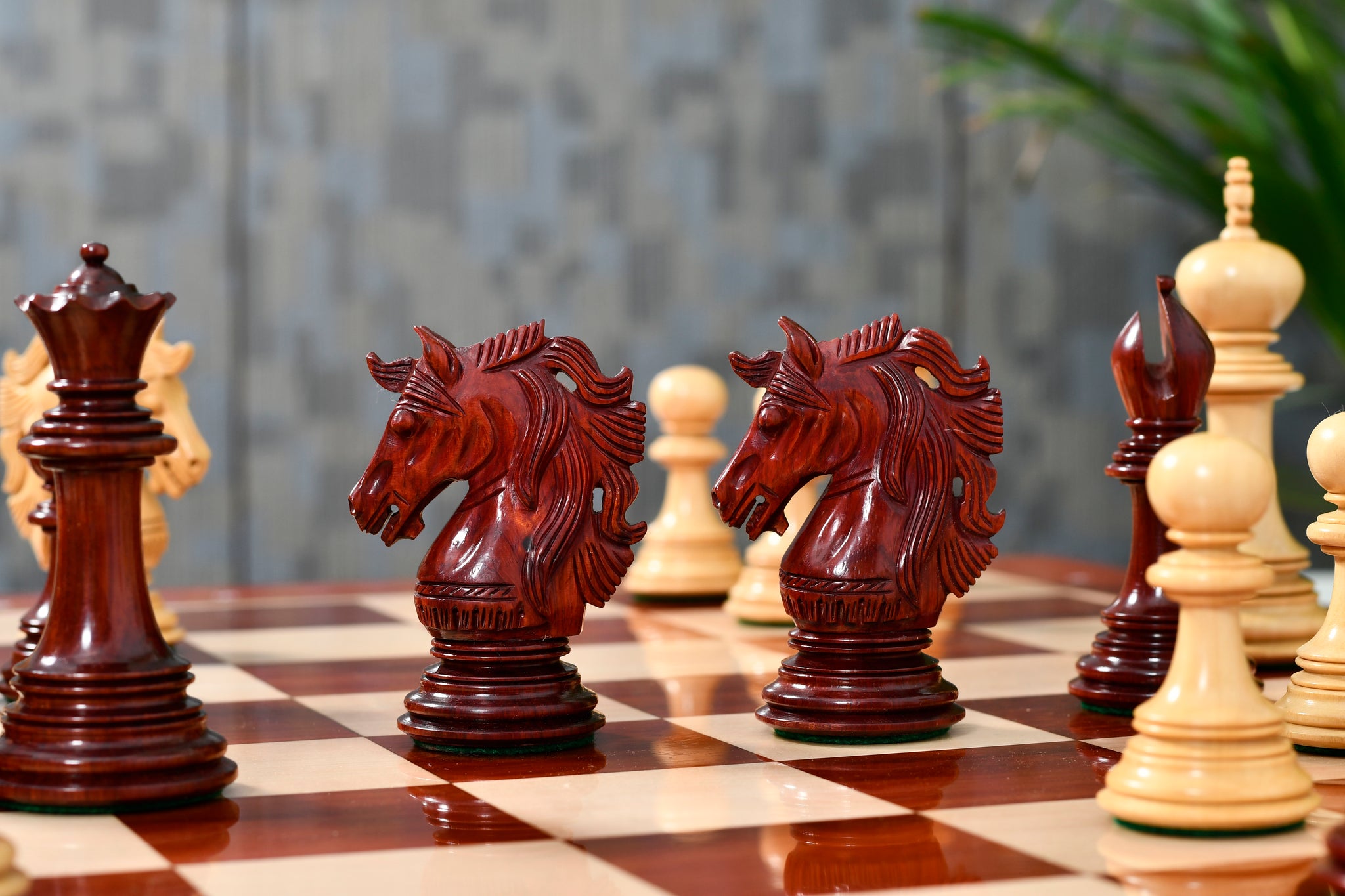 The opposing pieces are made of Natural Boxwood which is traditionally used for white side. It is one of the fairly easy woods to work with and shows off aesthetic detail. The set comes with free extra queens for effortless pawn promotion. All chess pieces are expertly carved and weighted for fantastic hand-feel and a very nice thud on the wooden chess board. King, Queens, Bishops, and Pawns have unique rings and thick green felts, which precisely envelops the base of each chessmen for smooth movement on the chess board. The knights are well-crafted and represent the highest grade of knight carving skills that our Indian artisans have to offer.